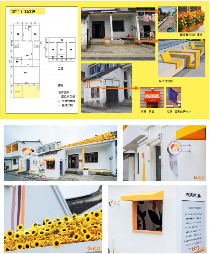在他主導(dǎo)的《院子2022》改造項目中,對庭院、廚房、臥室等實用空間進行刷白修繕的同時,將藝術(shù)創(chuàng)作巧妙融入每一處場景,比如門口和小房間安置了光線座椅和屋頂黃色花卉光線裝置,還有品牌燈牌和主題雨棚,在前廳和廚房的墻面進行主題繪畫創(chuàng)作。