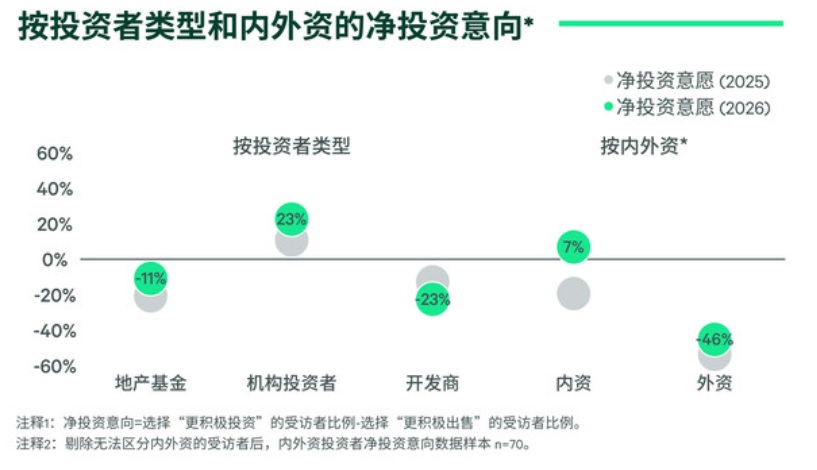 盡管整體市場仍以凈出售為主導(dǎo),但不同類型投資者的意向呈現(xiàn)分化趨勢:機(jī)構(gòu)投資者與地產(chǎn)基金的凈投資意向有所回升,開發(fā)商受限于流動性壓力,凈出售意愿較上年進(jìn)一步走強(qiáng)。分內(nèi)外資看,在機(jī)構(gòu)投資者和地產(chǎn)基金的推動下, 2026 年內(nèi)資投資者凈投資意向由負(fù)轉(zhuǎn)正,而外資繼續(xù)呈現(xiàn)凈出售意愿。