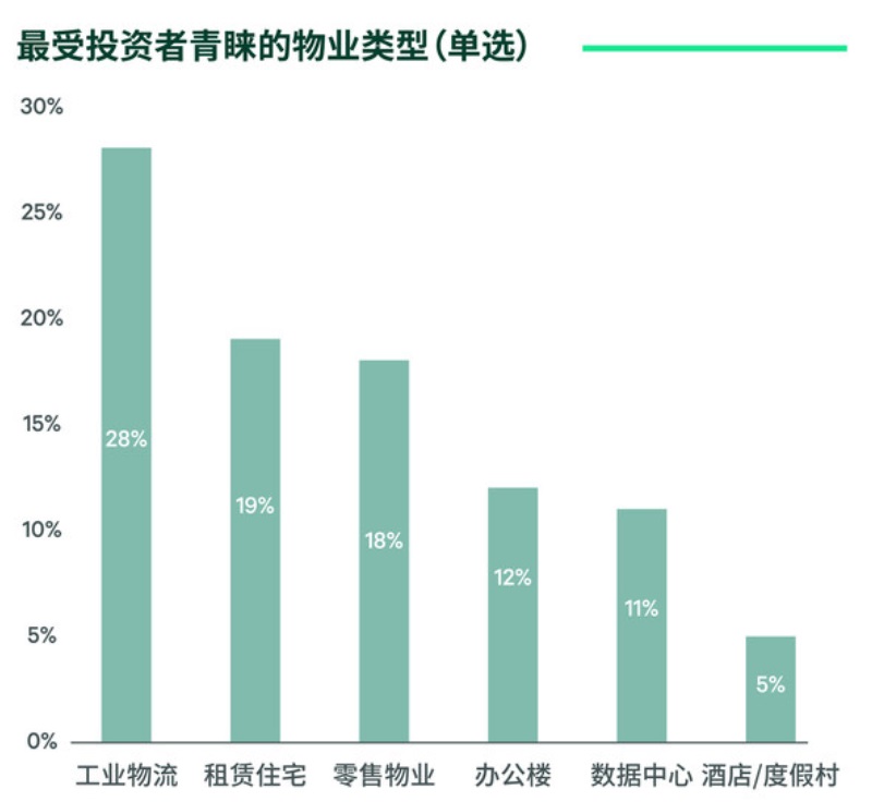 投資策略方面,核心型與核心增益型策略受青睞,占比合計達(dá)58%,較去年上升11個百分點(diǎn)。工業(yè)物流、租賃住宅和零售物業(yè)依然是投資者最關(guān)注的前三大物業(yè)類型,其中: