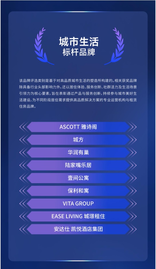 該品牌評選類別是基于對高品質(zhì)城市生活的塑造所構(gòu)建的。相關(guān)獲獎品牌除具備行業(yè)頭部影響力外,還以居住體驗、服務(wù)創(chuàng)新、社群活力及生活場景引領(lǐng)力為核心要素,旨在表彰通過產(chǎn)品與服務(wù)創(chuàng)新,持續(xù)參與城市美好生活建設(shè),為不同階段居住需求提供高品質(zhì)解決方案的專業(yè)運(yùn)營機(jī)構(gòu)與租賃住房品牌。