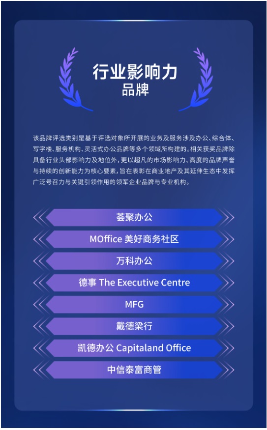該品牌評選類別是基于評選對象所開展的業(yè)務(wù)及服務(wù)涉及辦公、綜合體、寫字樓、服務(wù)機(jī)構(gòu)、靈活式辦公品牌等多個領(lǐng)域所構(gòu)建的。相關(guān)獲獎品牌除具備行業(yè)頭部影響力及地位外,更以超凡的市場影響力、高度的品牌聲譽(yù)與持續(xù)的創(chuàng)新能力為核心要素,旨在表彰在商業(yè)地產(chǎn)及其延伸生態(tài)中發(fā)揮廣泛號召力與關(guān)鍵引領(lǐng)作用的領(lǐng)軍企業(yè)品牌與專業(yè)機(jī)構(gòu)。