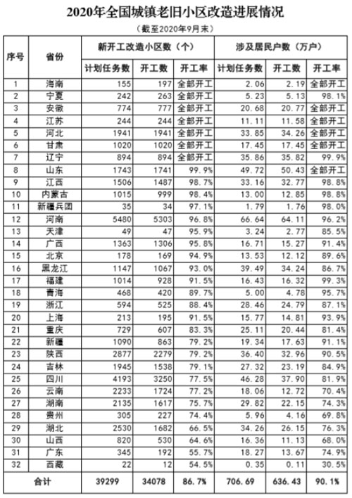 其中,按小區(qū)數(shù)計(jì),開工進(jìn)展較快的地區(qū):海南、寧夏、安徽、江蘇、河北、甘肅、遼寧等7省份開工率均已達(dá)到或超過100%;開工進(jìn)展較慢的地區(qū):貴州74.4%,湖北66.5%,山西64.6%,廣東55.7%,西藏54.5%。