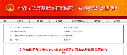 房訊網(wǎng)訊 1月7日,國家文化和旅游部發(fā)布公告,確定22家旅游景區(qū)為國家5A級旅游景區(qū)。