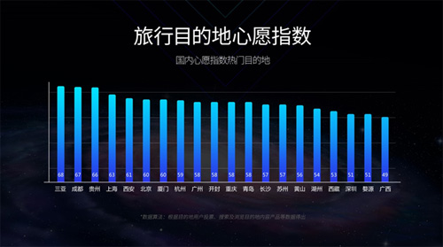 具體來(lái)看,目前國(guó)內(nèi)的疫后心愿指數(shù)整體前三名分別是三亞、成都、貴州。其中三亞、成都和貴州的綜合指數(shù)分別達(dá)到68、67和66。從出境市場(chǎng)來(lái)看,除了泰國(guó)、日本、新加坡三個(gè)“老朋友”,目的地心愿指數(shù)排名靠前的目的地還包括越南、迪拜、印度尼西亞、馬來(lái)西亞等國(guó)家或地區(qū)。