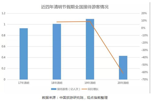 數(shù)據(jù)顯示,2020年清明假日期間,國內(nèi)旅游接待總?cè)藬?shù)4325.4萬人次,同比減少61.4%;實(shí)現(xiàn)旅游收入82.6億元,同比減少80.7%。