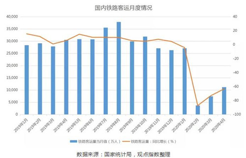 從鐵路數(shù)據(jù)上看,4月鐵路客運(yùn)量11160萬人,同比下跌63.5%;1-4月累計(jì)鐵路客運(yùn)量49504萬人,同比下跌57.3%。對比來看,鐵路運(yùn)輸客運(yùn)量環(huán)比上升48.9%,而民航僅上升10.3%,可見鐵路運(yùn)輸雖然同樣處于低點(diǎn),但恢復(fù)速度較民航運(yùn)輸更快。