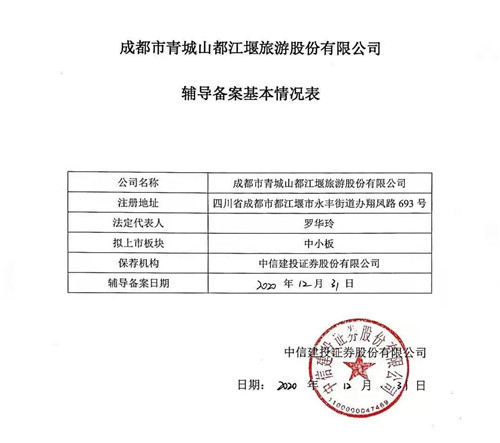 旅游企業(yè)資本化的腳步越來越快。日前,新旅界獲悉,成都市青城山都江堰旅游股份有限公司(以下簡稱“青都旅游”)已于2020年12月31日完成上市輔導(dǎo)備案。從四川證監(jiān)局官網(wǎng)公布的輔導(dǎo)備案情況表看,青都旅游擬登陸深交所中小板,保薦機構(gòu)為中信建設(shè)證券股份有限公司。