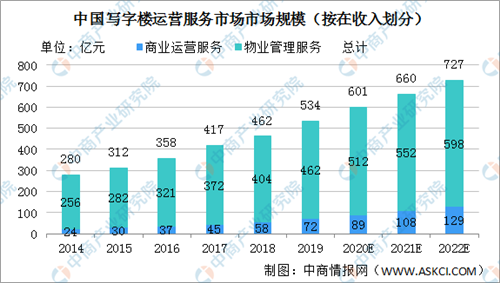 中國寫字樓運(yùn)營服務(wù)市場近年來保持了快速增長。2014年中國寫字樓運(yùn)營服務(wù)市場總收入280億元,2019年的534億元,復(fù)合年增長率為13.8%。隨著商業(yè)運(yùn)營服務(wù)市場高速增長,預(yù)計(jì)2020年中國寫字樓運(yùn)營服務(wù)市場總收入將達(dá)601億元,2022年將增至727億元。