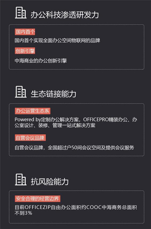 COOC通過穩(wěn)定的投資策略實現(xiàn)既定擴(kuò)張,堅定輕資產(chǎn)商業(yè)模式的拓展,除此之外,圍繞COOC的商辦運營生態(tài),織就一張商辦運營生態(tài)網(wǎng),用生態(tài)鏈接能力,撬動萬億級企業(yè)服務(wù)市場。以甲級寫字樓為經(jīng)營基石,形成客群的相互孵化培育、資源共享。