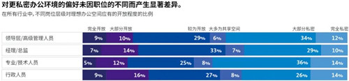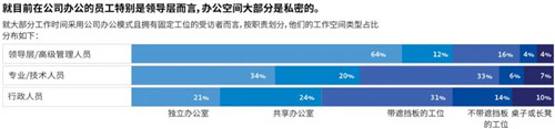 疫情之前,無固定工位的美國員工中有50%希望擁有固定工位。無固定工位主要適用于嚴重依賴面對面協(xié)作開展工作的員工,而非需要長時間集中精力辦公的員工,F(xiàn)在,希望獲得固定工位的員工比以往任何時候都多。此外,大多數(shù)美國員工愿意犧牲居家辦公的靈活性,以換取在公司辦公擁有固定工位。在返回公司辦公的領(lǐng)導(dǎo)層中,獲得自己中意工位的人員占比較高。行政人員和專業(yè)技術(shù)人員沒有固定工位的可能性要高于領(lǐng)導(dǎo)層。目前,人們發(fā)現(xiàn),與固定工位相比,無固定工位不利于保持適當?shù)纳缃痪嚯x、隱私保護、健康福祉。