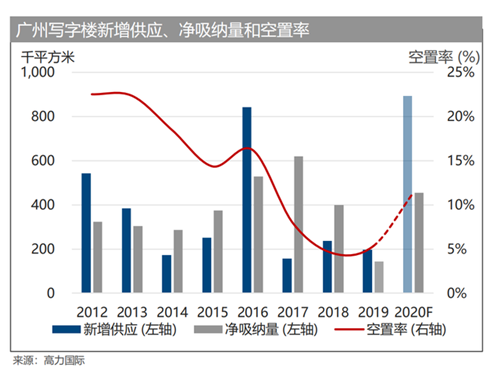高力國際報告顯示,2020年廣州寫字樓新增供應(yīng)達(dá)到頂峰,新增可租賃面積達(dá)到89萬平方米,比2017年至2019年三年的供應(yīng)總和(59萬平方米)還高出51%,空置率預(yù)計從由5.3%攀升至11.4%;深圳則將有約112萬平米的新增甲級寫字樓入市,同比2019年高出58%,空置率預(yù)計從21.2%微升至24.9%。