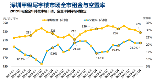 戴德梁行則在《深圳寫字樓市場2019年第四季度》報告中指出,雖然2019年第四季度市場租賃成交活躍度較三季度略有回升,但成交主要以更低租金、更小面積的換租需求為主,市場整體吸納情況不容樂觀。業(yè)主給予的優(yōu)惠租金及補(bǔ)貼將一定程度抹平違約租期的影響,預(yù)計2020年對優(yōu)質(zhì)客戶的爭奪還將持續(xù),不過隨著換租需求的逐漸消耗及持續(xù)的高供應(yīng),甲級寫字樓的租金及空置率或承受更大壓力,而最終能扭轉(zhuǎn)市場表現(xiàn)的新增需求則將依賴于經(jīng)濟(jì)環(huán)境的改善。