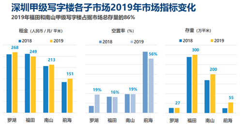 相較之下,2019年以來,深圳寫字樓市場情況一直是市場關(guān)注的焦點(diǎn)。據(jù)第一太平戴維斯發(fā)布的數(shù)據(jù),2019年深圳全年累計共有107.7萬平方米新增寫字樓面積交付入市,同比擴(kuò)大49.1%,推動深圳甲級寫字樓總存量同比上升17.7%至715.6萬平方米。