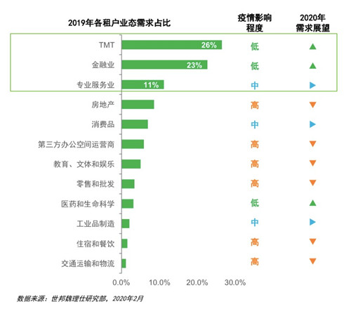 此次疫情,餐飲、零售和交通運(yùn)輸?shù)刃袠I(yè)租戶受影響較大,對主要需求驅(qū)動行業(yè)(TMT、 金融業(yè)和專業(yè)服務(wù)業(yè))的影響較小,甚至可能刺激某些科技類企業(yè)的辦公租賃需求的加速增長,如在線游戲和教育、企業(yè)在線辦公服務(wù)等。
