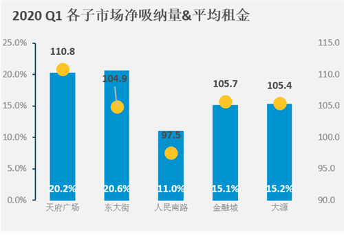 由于部分租戶退租,一季度凈吸納量僅為2600平方米,空置率小幅下降至18.7%,其中人民南路、東大街和成華區(qū)凈吸納量為負,退租的企業(yè)以受疫情影響較為嚴重的旅游、線下教育、貿(mào)易和醫(yī)美等行業(yè)為主。一季度新簽約的客戶以去年的遺留客戶為主要集中在傳統(tǒng)金融、TMT及房地產(chǎn)行業(yè)。