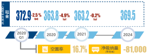 平均凈有效租金為372.9元每平方米每月,環(huán)比下降2.5%。鑒于疫情后期的市場狀態(tài),以及新增供應(yīng)量的逐步入市,租金企穩(wěn)預(yù)期大概會(huì)在明年一季度出現(xiàn)。