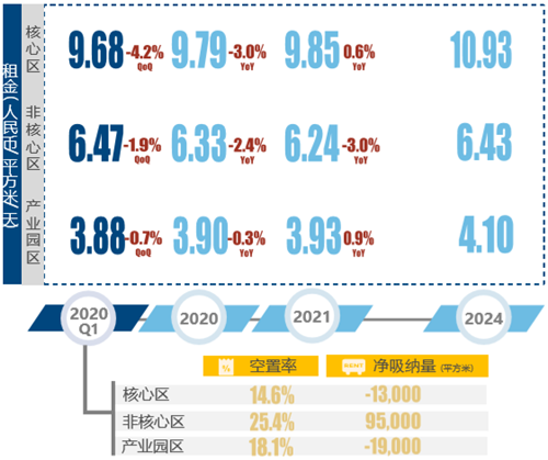 2020年第一季度,新冠疫情導(dǎo)致了整體市場活動(dòng)處于停滯狀態(tài),各類需求受到短期壓制,本季度凈吸納量約為-81,000平方米,除了CBD和麗澤子市場外,其他市場都錄得負(fù)吸納量;