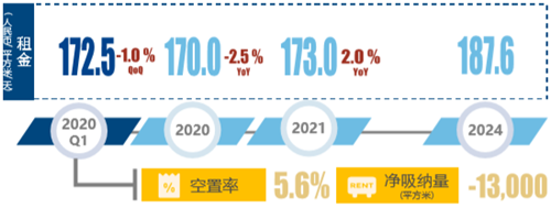 預(yù)計(jì)2020年內(nèi),需求放緩與空置率的提升將使租金階段性下調(diào),但預(yù)計(jì)將于2021年恢復(fù)增長并將在未來五年保持上揚(yáng)態(tài)勢(shì)。因此2020年對(duì)有尋求簽訂新租約需求的租戶來說,將是難得的談判窗口期。