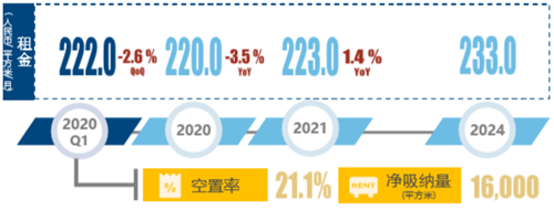 > 疫情帶來租金壓力,一季度業(yè)主普遍下調(diào)租金以吸引與挽留租戶,各大重點(diǎn)城市租金均下降。
