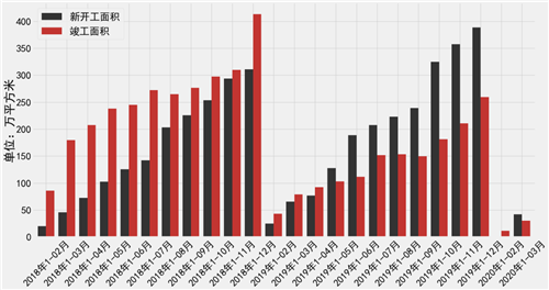 圖:2018年1月~2020年03月上海寫字樓新開工和竣工面積(單位:萬㎡)
