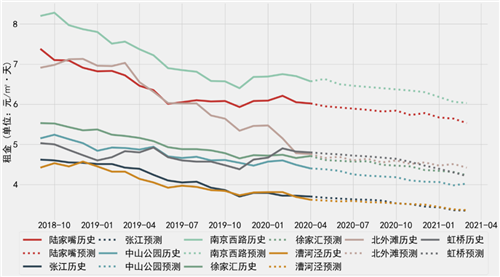 圖:上海8大商圈甲乙級寫字樓歷史租金及未來走勢預(yù)測(2018年9月~2021年3月)