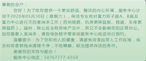 據(jù)北京富力中心官微消息,05月30日,保潔專業(yè)將對富力雙子座A、B座及富力中心進(jìn)行滅四害消殺工作(藥劑噴灑、機(jī)房更換鼠板、樓道、車庫更換鼠藥)。