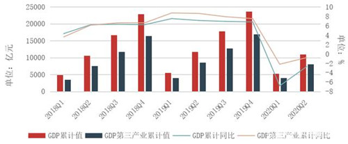 圖:2018年Q1~2020年Q2廣州GDP、第三產(chǎn)業(yè)累計值及同比