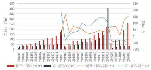 圖:2018年1月~2020年6月廣州寫字樓新開工和竣工面積