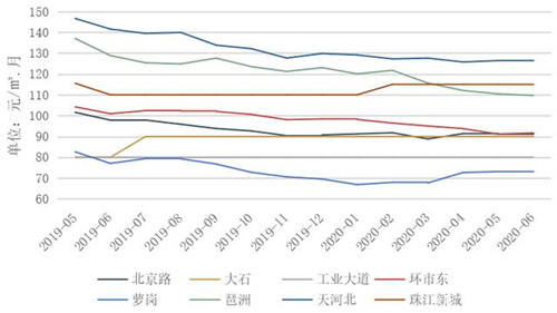 圖:2019年5月~2020年6月深圳重點(diǎn)商圈甲乙級寫字樓租金走勢