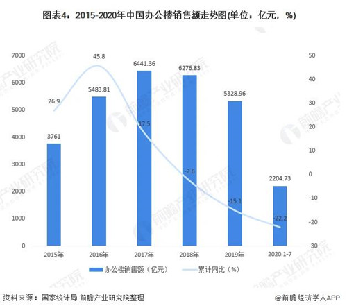 受辦公樓銷售面積快速下滑影響,國內(nèi)辦公樓銷售額在2019年跌破6000億元,至5328.96億元,同比下降15.1%,下降幅度從2018年的2.6%擴大至2019年的15.1%。2020年再加上新冠疫情影響,我國辦公樓銷售額大幅下降22.2%至2204.73億元。