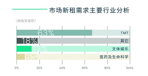 TMT行業(yè)依舊是整體市場租賃需求的主引擎,除了互聯(lián)網(wǎng)企業(yè),集成電路行業(yè)亦表現(xiàn)活躍;醫(yī)藥健康和傳媒行業(yè)延續(xù)上季度的活躍態(tài)勢。