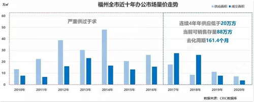 從福州近十年的辦公市場來看,整體其實(shí)已經(jīng)呈現(xiàn)嚴(yán)重供過于求的態(tài)勢,且連續(xù)4年年供應(yīng)低于20萬方。而當(dāng)前的可銷售存量已達(dá)到了88萬方,去化周期高達(dá)161.4個月。