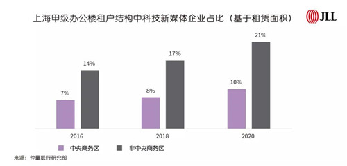 產(chǎn)業(yè)集群是衡量辦公樓商務(wù)板塊規(guī)模的重要指標(biāo),包含了產(chǎn)業(yè)規(guī)模、企業(yè)活躍度、人才聚集等要素。研究表明,在上海的辦公樓租戶構(gòu)成中,金融服務(wù)業(yè)已成為基石行業(yè),在中央商務(wù)區(qū)租戶中占比超過四成,在非中央商務(wù)區(qū)占比達(dá)30%,且逐漸呈上升之勢;而科技新媒體行業(yè)同樣推動辦公樓需求持續(xù)增長,帶動辦公樓板塊的產(chǎn)業(yè)聚集。