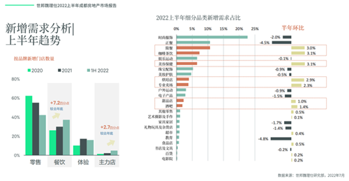 而在零售物業(yè)方面,由于疫情的反復阻礙跨城市旅游,品牌的擴張需求放緩,尤其是服飾及大型正餐品牌,成都零售物業(yè)市場凈吸納量為負值,整體空置率較去年底上升0.9個百分點到8%。其中,教育、正餐和服飾需求半年環(huán)比下降最大,分別下降了4.8%、4.5%和2%。