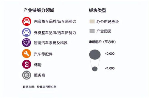 上海產(chǎn)業(yè)園區(qū)內(nèi)承載了眾多此類企業(yè)的租賃需求,以整車品牌商為例,許多公司選擇在漕河涇、張江等產(chǎn)業(yè)園區(qū)板塊內(nèi)的獨(dú)棟項(xiàng)目作為其總部與研發(fā)中心。張江集成電路半導(dǎo)體等產(chǎn)業(yè)基礎(chǔ)成為車載芯片以及造車品牌研發(fā)的辦公首選地之一;金橋板塊借助其傳統(tǒng)制造業(yè)的優(yōu)勢(shì),吸引了眾多新勢(shì)力品牌以及智能技術(shù)公司。
