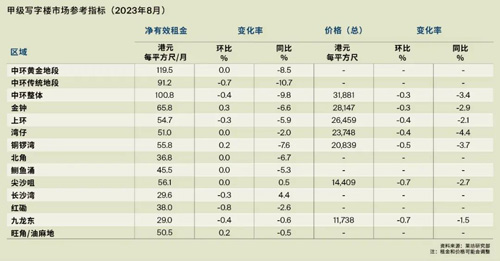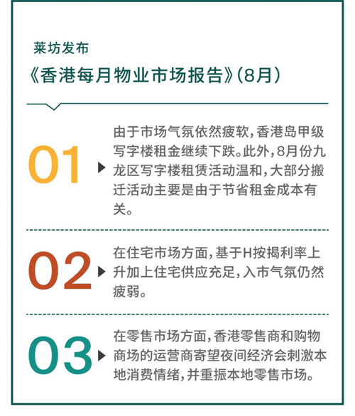 八月份租賃活動溫和,大部分搬遷都跟節(jié)省成本有關。跟7月份一樣,主要租賃交易以3,000平方英尺以下及租金每平方英尺港幣22元的中小型面積寫字樓為主。電子和制造公司的租賃活動較為活躍。