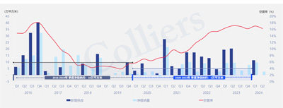 廣州甲級寫字樓新增供應(yīng)、凈吸納量和空置率(2016~2024 Q2)