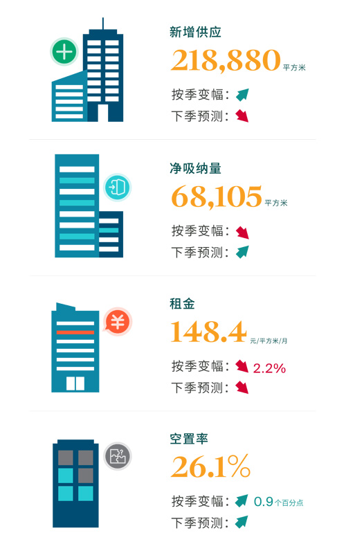 “展望第四季度,新增供應(yīng)的集中入市疊加市場需求疲弱,租賃價格仍將面臨一定下行壓力。預(yù)計業(yè)主方將繼續(xù)采取“價格調(diào)整+租期優(yōu)惠+免租期”組合策略以吸引租戶入駐。全市平均租金水平或?qū)⒀永m(xù)溫和下行趨勢,環(huán)比跌幅預(yù)計與本季度相近!