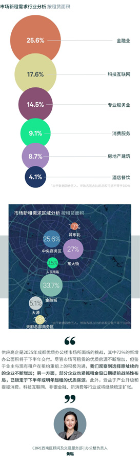 2025年上半年,部分樓宇因竣備或裝修延后而推遲交付,成都優(yōu)質(zhì)辦公樓市場(chǎng)共錄得4棟新建樓宇合計(jì)約24萬平方米的新增供應(yīng),雖僅為年初預(yù)測(cè)的60%,但也推動(dòng)總存量突破千萬規(guī)模;其中包括位于金融城的JFC交子金融廣場(chǎng)2號(hào)樓和美璟中心,位于傳統(tǒng)CBD的中廣智媒城,以及位于城東北的龍光世紀(jì)中心。