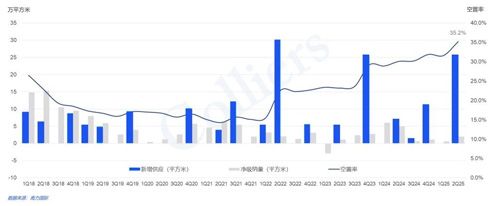 二季度,隨著部分新項目進入市場,全市空置率環(huán)比上升約3.6個百分點,至35.2%,同比上漲5.1%,市場空置壓力維持高位;隨著下半年新增供應(yīng)項目陸續(xù)入市,市場空置率將保持高企態(tài)勢。