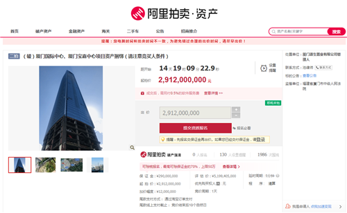 有著“廈門第一高樓”的廈門國(guó)際中心及副塔樓廈門寶嘉中心項(xiàng)目將在11月10日進(jìn)行二次拍賣,競(jìng)價(jià)周期為1天。