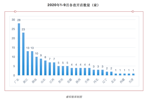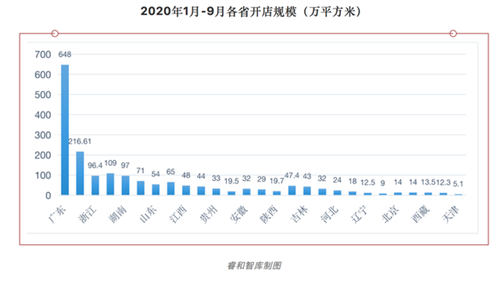 據(jù)不完全統(tǒng)計(jì),2020年前三季度,購(gòu)物中心(面積≥2萬平方米)新開業(yè)的數(shù)量為169家。1月份,共有39家新的購(gòu)物中心開業(yè)。受疫情的影響,2-4月,每月只有1家購(gòu)物中心新開業(yè),之后逐漸好轉(zhuǎn),但5-8月每月的開店數(shù)量均沒有超過20家。從9月份開始,購(gòu)物中心大規(guī)模開店,共計(jì)69家。其中廣東省開店的數(shù)量最多,共有28家,2名-5名分別為江蘇、浙江、四川和湖南。