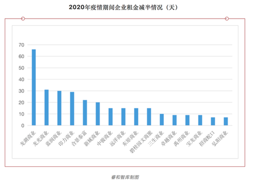 從減租時(shí)間范圍來看,時(shí)間長(zhǎng)短不一,短則一周左右,最長(zhǎng)則兩個(gè)月左右。根據(jù)公開數(shù)據(jù)統(tǒng)計(jì)整理的16家企業(yè)中,有7家企業(yè)免除一個(gè)月以上的全部租金,有6家企業(yè)免除半個(gè)月的租金,以及3家企業(yè)免除7-10天的租金。租金減半的16家企業(yè)中,龍湖商業(yè)減免的時(shí)間最長(zhǎng),多達(dá)68天。剩余的15家企業(yè)中,租金減半的企業(yè)從7天到31天不等,其中有5家企業(yè)租金減半時(shí)間超過20天。