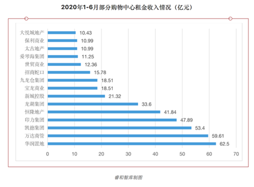 2020年上半年,華潤(rùn)置地的租金收入為62.5億元,超過2019年整年的租金收入為91.50億元的68%,華潤(rùn)商業(yè)也在疫情期間減免了9天的全部租金。排名第二的是萬達(dá)商管,或許是受到減免租戶一個(gè)月租金的影響,2020年上半年的租金為59.61億元,與2019年的351.48億元相差甚遠(yuǎn)。排名3-5位的是凱德集團(tuán)、印力集團(tuán)和恒隆地產(chǎn)。