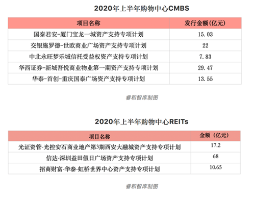 2020年前三季度發(fā)行的22個(gè)CMBS產(chǎn)品中,以購(gòu)物中心為底層資產(chǎn)的CMBS有5只,占總數(shù)量的23%,發(fā)行金額為87.88億元,占總體金額的27%。2020年發(fā)行的類REITs產(chǎn)品共12個(gè),其中以購(gòu)物中心為基礎(chǔ)標(biāo)的的類REITs有3只,占比25%,發(fā)行金額為95.85億元,占總體金額的44%。