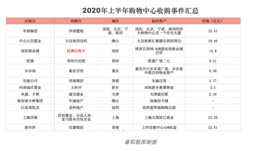 據(jù)不完全統(tǒng)計(jì),2020年上半年有12例購(gòu)物中心收購(gòu)事件,遍布全國(guó)各地。收購(gòu)方的企業(yè)性質(zhì)也不大相同,有國(guó)企、基金、信托和上市公司等。除了南海怡豐城和昆明愛琴海購(gòu)物公園兩個(gè)項(xiàng)目沒有披露收購(gòu)金額之外,剩余10個(gè)項(xiàng)目的收購(gòu)金額為132.97億元,相較于2019年上半年的288.41億元,大幅下降。