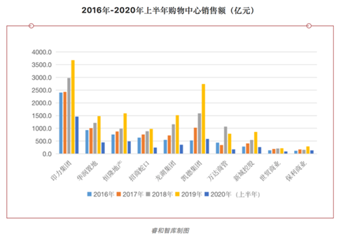 在統(tǒng)計(jì)的10家購(gòu)物中心中,除了萬達(dá)商管以外,剩余購(gòu)物中心的銷售額逐年遞增。但2020年上半年的銷售額,均未達(dá)到2019年銷售額的一半。2020年上半年,印力集團(tuán)的銷售額排名第一,為1463.5億元。