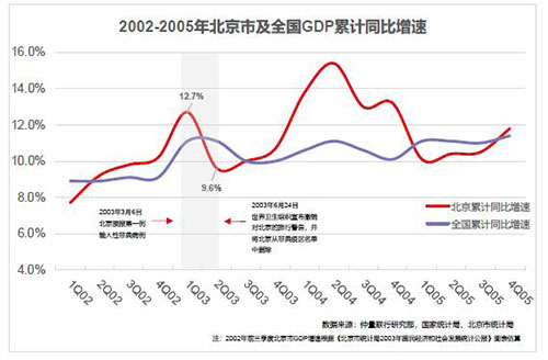 天災(zāi)、疾病、戰(zhàn)亂等獨立社會事件在所有經(jīng)濟預(yù)測模型中被視作外生變量,它具有突然性、偶然性、不可預(yù)測性的特征。這一次的疫情也正是這樣的一宗“黑天鵝”事件,并已開始對經(jīng)濟和生活產(chǎn)生重大影響。對于剛剛經(jīng)歷了2019年的壓力和挑戰(zhàn)的北京市場,不少辦公樓業(yè)主直呼此次新冠疫情使得市場形勢“雪上加霜”。此次研究,我們首先將著重分析北京市非典時期的經(jīng)濟市場情況,并與本市當前環(huán)境進行對比,隨后對北京辦公樓市場需求行業(yè)進行針對性研究,最后將闡釋對業(yè)主所進行的訪談?wù){(diào)查,希望對各位作出市場研判有一定幫助。