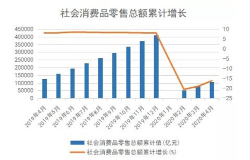 據(jù)國家統(tǒng)計(jì)局?jǐn)?shù)據(jù)顯示,4月社會(huì)消費(fèi)品零售總額當(dāng)期值為28178億元,同比下降7.5%;而1-4月的累計(jì)值為106758億元,累計(jì)增長為-16.2%。與1-3月的累計(jì)值78579.7億元,累計(jì)增長-19%相比,下降幅度明顯減小。