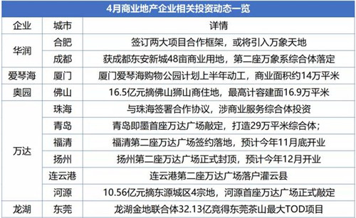 需要注意的是,雖然購物中心開業(yè)數(shù)量繼續(xù)低位運(yùn)行,但是投資卻有回溫跡象,月內(nèi)萬達(dá)、華潤、龍湖等企業(yè)均有項(xiàng)目新動(dòng)態(tài)。